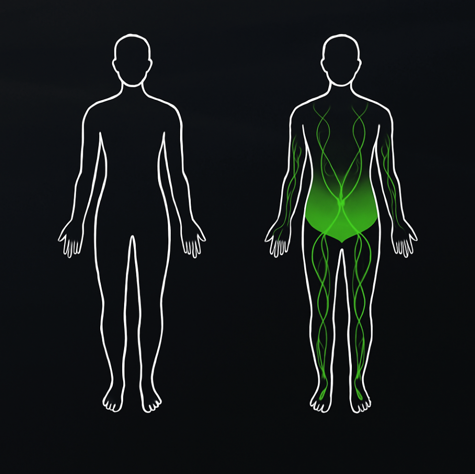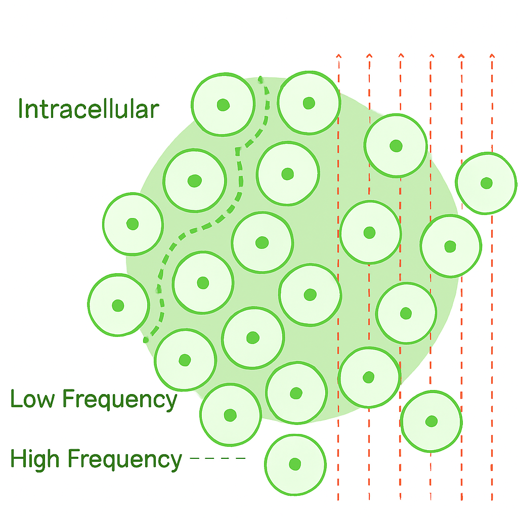 Lower frequencies assess what's happening outside your cells. Higher frequencies dive deeper, measuring inside. This allows the scanner to calculate your extracellular water (ECW), intracellular water (ICW), and total body water — key indicators of your health, hydration, and potential risk factors like inflammation or fluid retention.